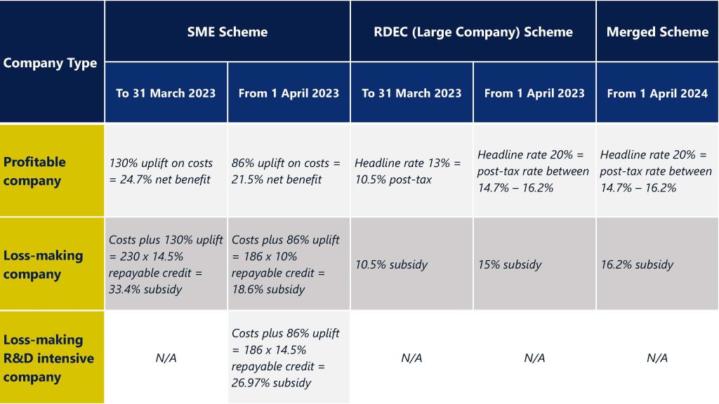 A key point of the reforms was that from 1 April 2023, the additional deduction for SMEs was reduced from 130% to 86%, while for large companies (under the RDEC scheme), the credit was increased from 13% to 20%. However, as of 1 April 2024, both schemes have been merged, so all companies can now claim at the 20% rate regardless of their size.